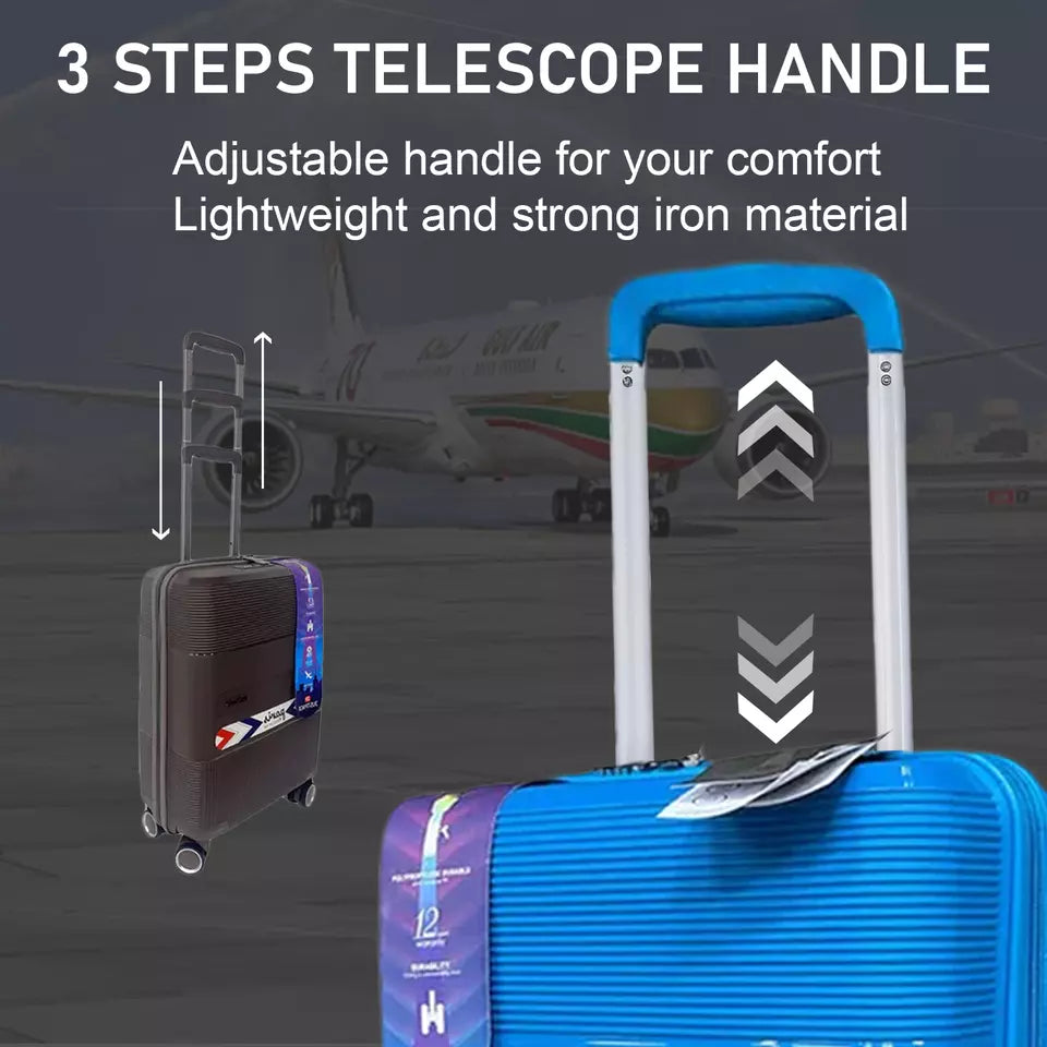 Iron Trolley System: The suitcase is designed with a robust iron trolley system, featuring a telescoping handle for effortless handling and control while on the move.